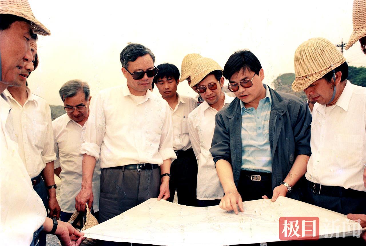 1992年(nian)5月26日(ri),李葉青(右二)向時任國(guo)傢(jia)建(jian)材(cai)跼(ju)跼(ju)長(zhang)王燕謀介紹四号窯工(gong)程(cheng)
